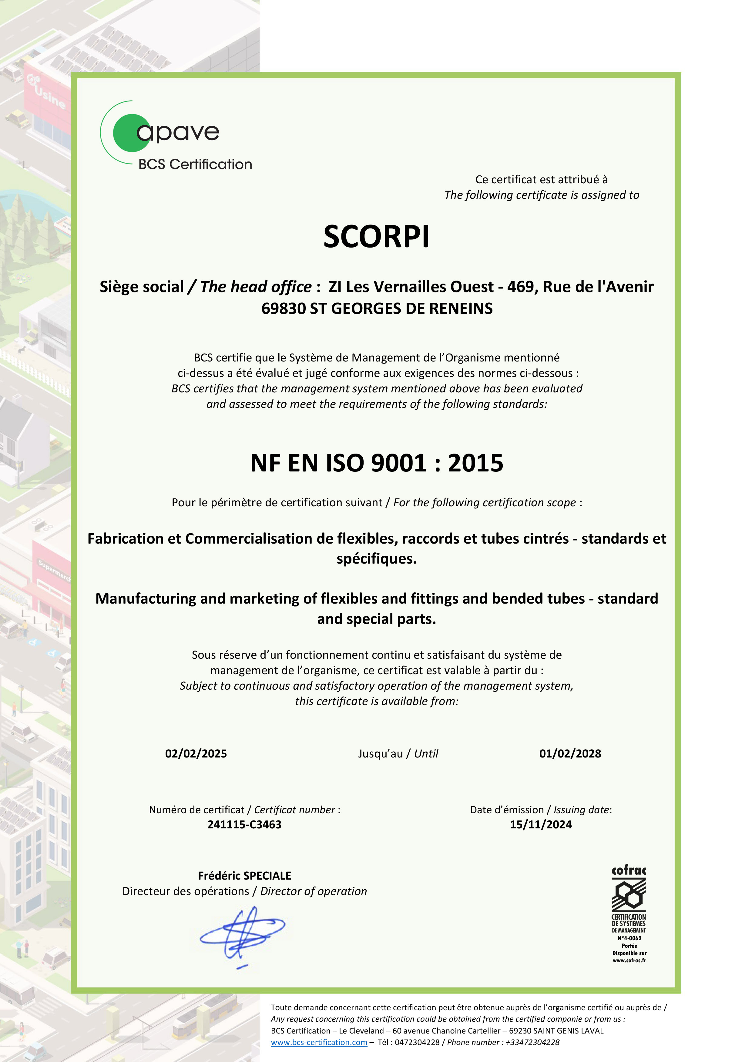 Scorpi France, acteur reconnu dans les solutions personnalisées pour le transfert de fluides, a le plaisir d’annoncer le renouvellement de sa certification ISO 9001. Ce renouvellement illustre la robustesse de son organisation interne et sa volonté constante de placer la qualité et la satisfaction client au centre de ses priorités.